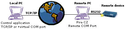 The RS232 device is connected to a serial COM port of the remote PC and you may control